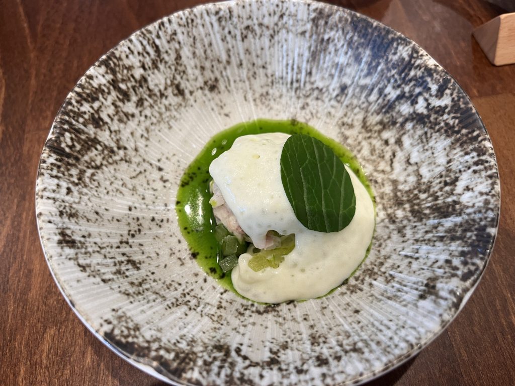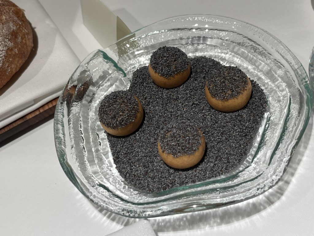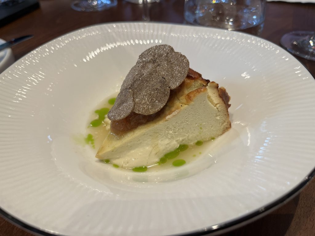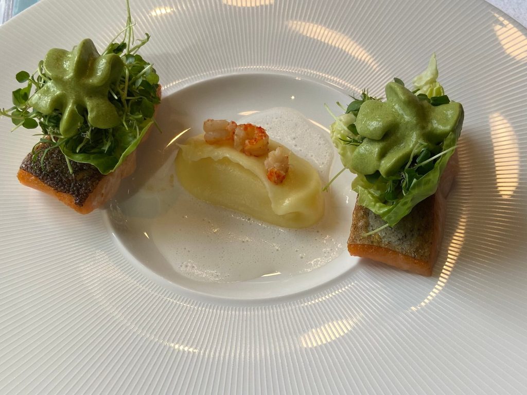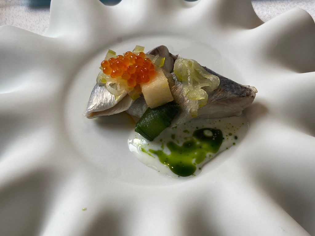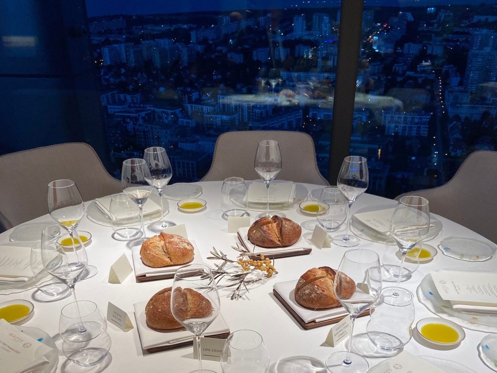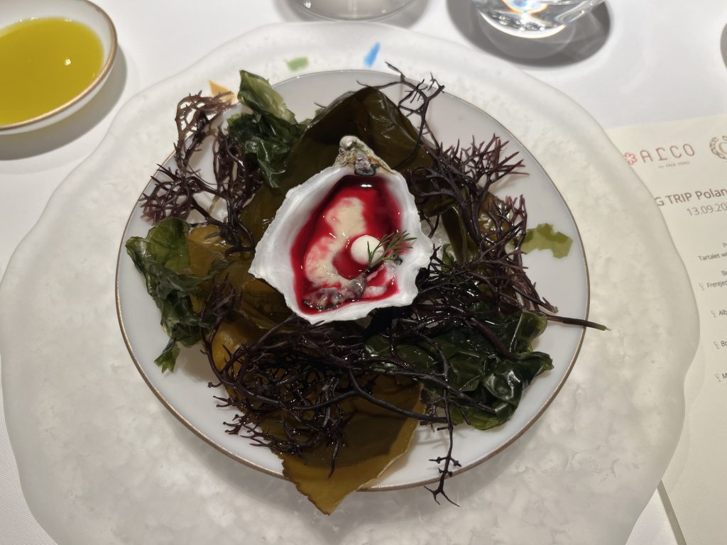 We arrive at 7 p.m. at the Arco restaurant on the 33rd floor of the Olivia Star building with a panoramic view of the city. Arco, together with Chef Paco Perez and Head Chef Antonio Arcieri, offers a refined fusion cuisine combining Spanish and Mediterranean flavours with Polish touches, resulting in extraordinary dishes. In 2024, Arco was awarded its first Michelin star in Gdansk (and the only one in northern Poland) in recognition of its exceptional cuisine and service. Cocktail tables draped in black, cheese pierogi, and caviar tartlets. Iberian ham croquettes. On the set tables, decorative detail: a silver sea buckthorn stem and its fruits in amber. Maciej: “We have reached the highest point in altitude.” The set designer is Dany Garcia and the style is Arco (bow). Presentation plates, very beautiful and glass clear bread plates. The starters are placed on the table, potato salad shaped in balls in the hollow of a container with hands clasped as an offering, trout caviar tartlets, Cebularz (onion bread). Oyster on beetroot juice placed on seaweed (Borscht & Oyster). Bluefin tuna, yuzu and tomato salad full of colour and freshness. Chawanmushi parsley roots. Italian groserano cheese risotto topped with two shrimps in head-to-toe. Venison and its sauce, green purée, a little overcooked. Revisited Tatin pie without dough and vanilla ice cream (szarlotka). The wines are remarkable. It’s Daniel’s birthday, mini cake with a candle, vodka with two glasses. La belle Agnès (Belle Hélène pear but replaced by raspberry). Mignardises with a beautiful presentation. Maciej and the Chef face us. Fabien comments: “It was an international dinner, with the flavours of three different countries, an exchange of ideas and tastes. Sixteen persons were working for us, amuse-bouches had the influence of Poland journey with their colours, flavours and textures. Creamy risotto, venison should have been cooked less. Dessert consisted of apple layers and cinnamon, belle Hélène new version. But wine bottles were not presented during the dinner.” Maciej thanks all the team.