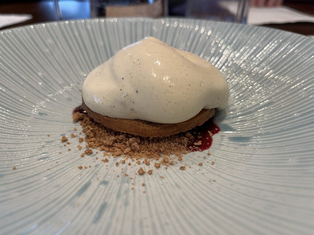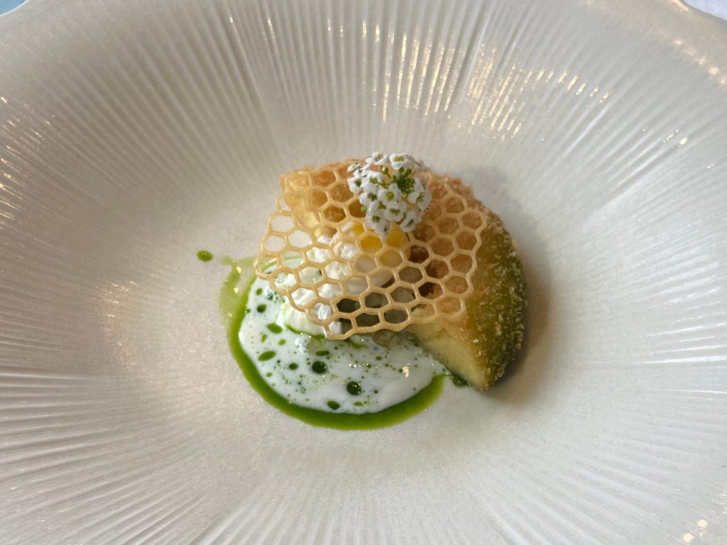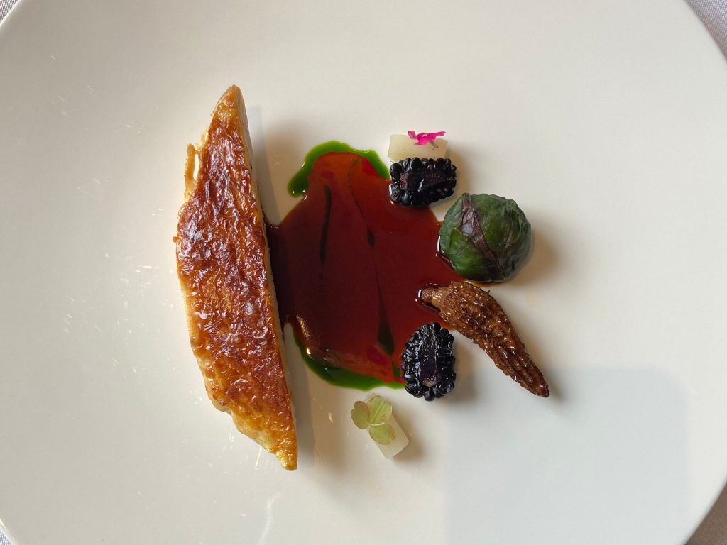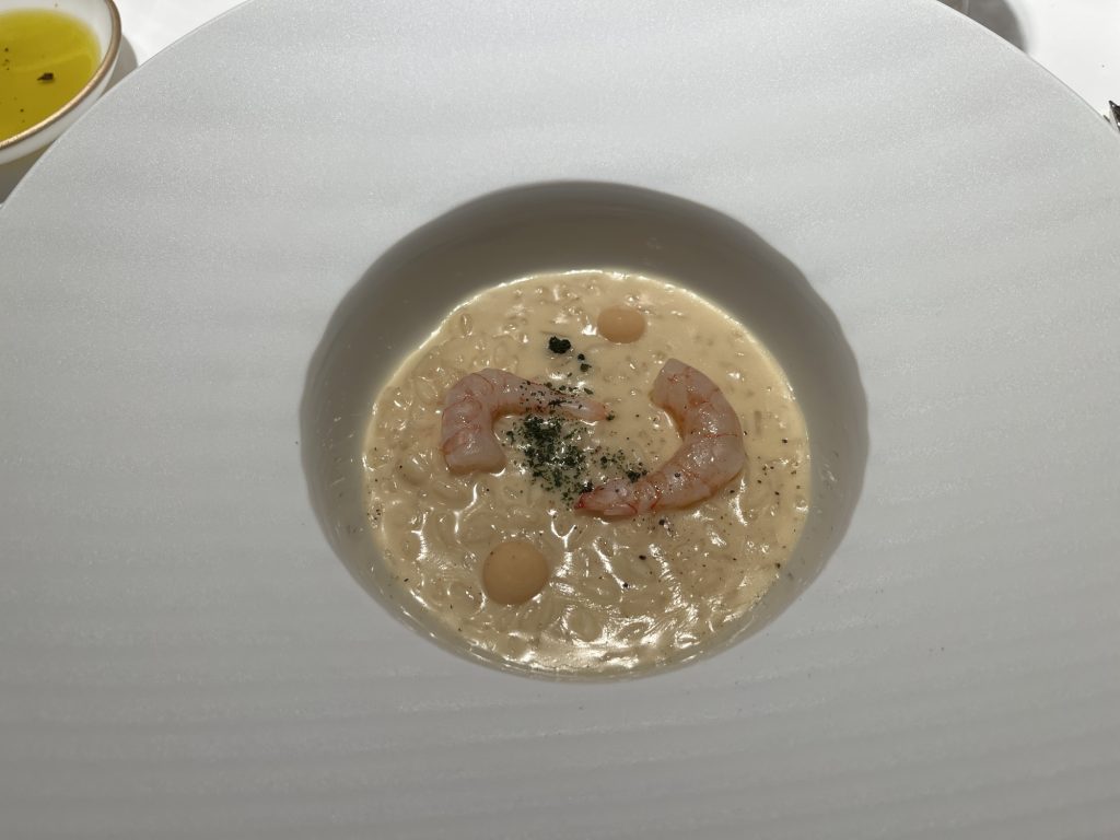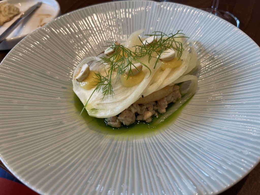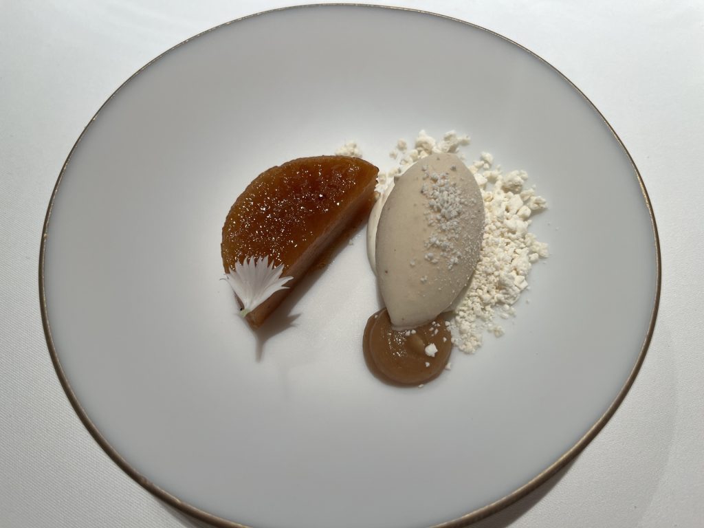 We arrive at 7 p.m. at the Arco restaurant on the 33rd floor of the Olivia Star building with a panoramic view of the city. Arco, together with Chef Paco Perez and Head Chef Antonio Arcieri, offers a refined fusion cuisine combining Spanish and Mediterranean flavours with Polish touches, resulting in extraordinary dishes. In 2024, Arco was awarded its first Michelin star in Gdansk (and the only one in northern Poland) in recognition of its exceptional cuisine and service. Cocktail tables draped in black, cheese pierogi, and caviar tartlets. Iberian ham croquettes. On the set tables, decorative detail: a silver sea buckthorn stem and its fruits in amber. Maciej: “We have reached the highest point in altitude.” The set designer is Dany Garcia and the style is Arco (bow). Presentation plates, very beautiful and glass clear bread plates. The starters are placed on the table, potato salad shaped in balls in the hollow of a container with hands clasped as an offering, trout caviar tartlets, Cebularz (onion bread). Oyster on beetroot juice placed on seaweed (Borscht & Oyster). Bluefin tuna, yuzu and tomato salad full of colour and freshness. Chawanmushi parsley roots. Italian groserano cheese risotto topped with two shrimps in head-to-toe. Venison and its sauce, green purée, a little overcooked. Revisited Tatin pie without dough and vanilla ice cream (szarlotka). The wines are remarkable. It’s Daniel’s birthday, mini cake with a candle, vodka with two glasses. La belle Agnès (Belle Hélène pear but replaced by raspberry). Mignardises with a beautiful presentation. Maciej and the Chef face us. Fabien comments: “It was an international dinner, with the flavours of three different countries, an exchange of ideas and tastes. Sixteen persons were working for us, amuse-bouches had the influence of Poland journey with their colours, flavours and textures. Creamy risotto, venison should have been cooked less. Dessert consisted of apple layers and cinnamon, belle Hélène new version. But wine bottles were not presented during the dinner.” Maciej thanks all the team.