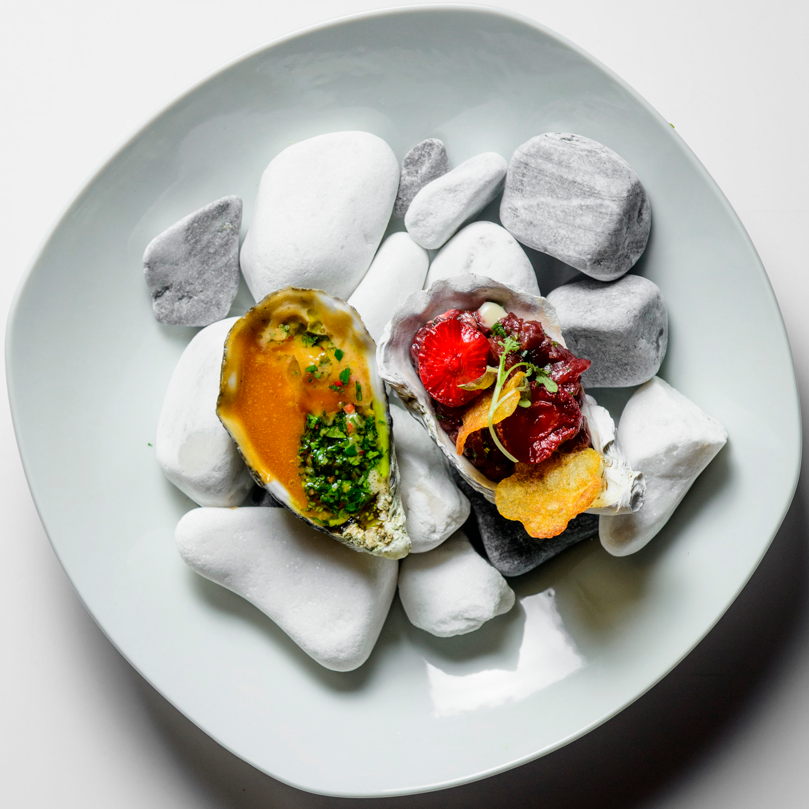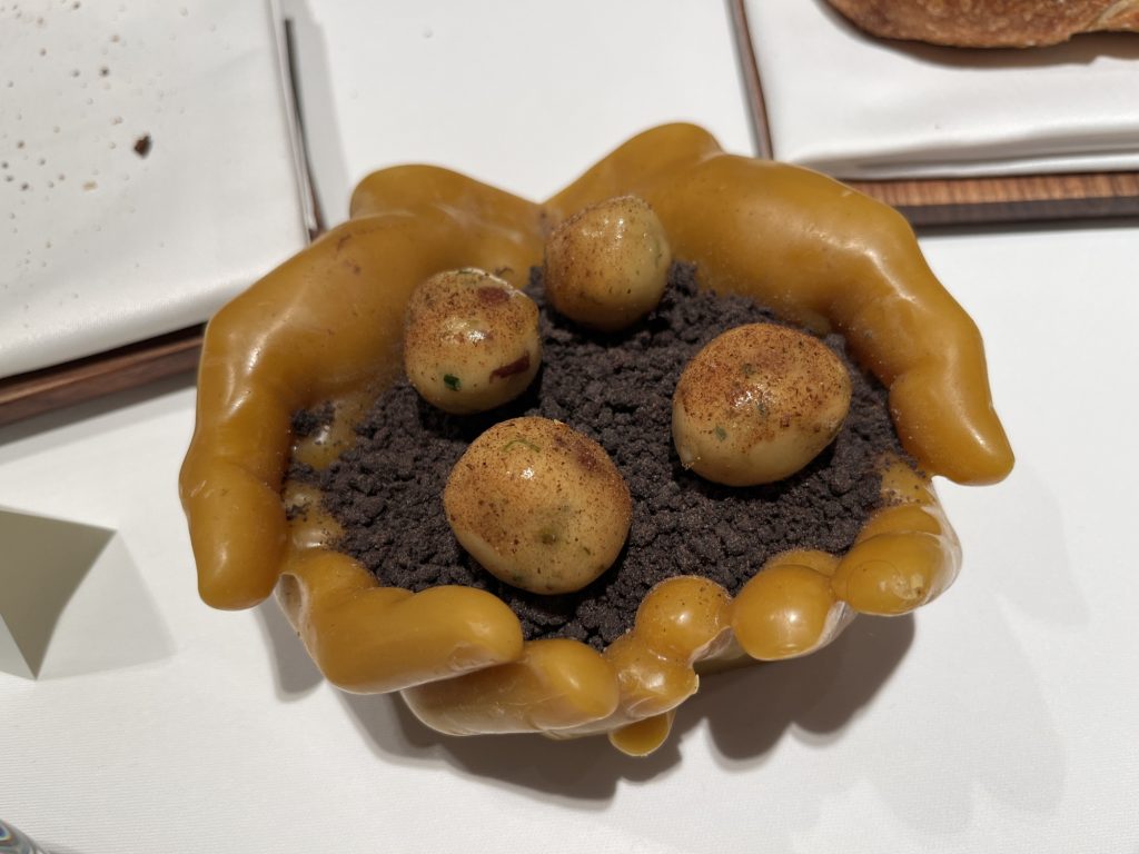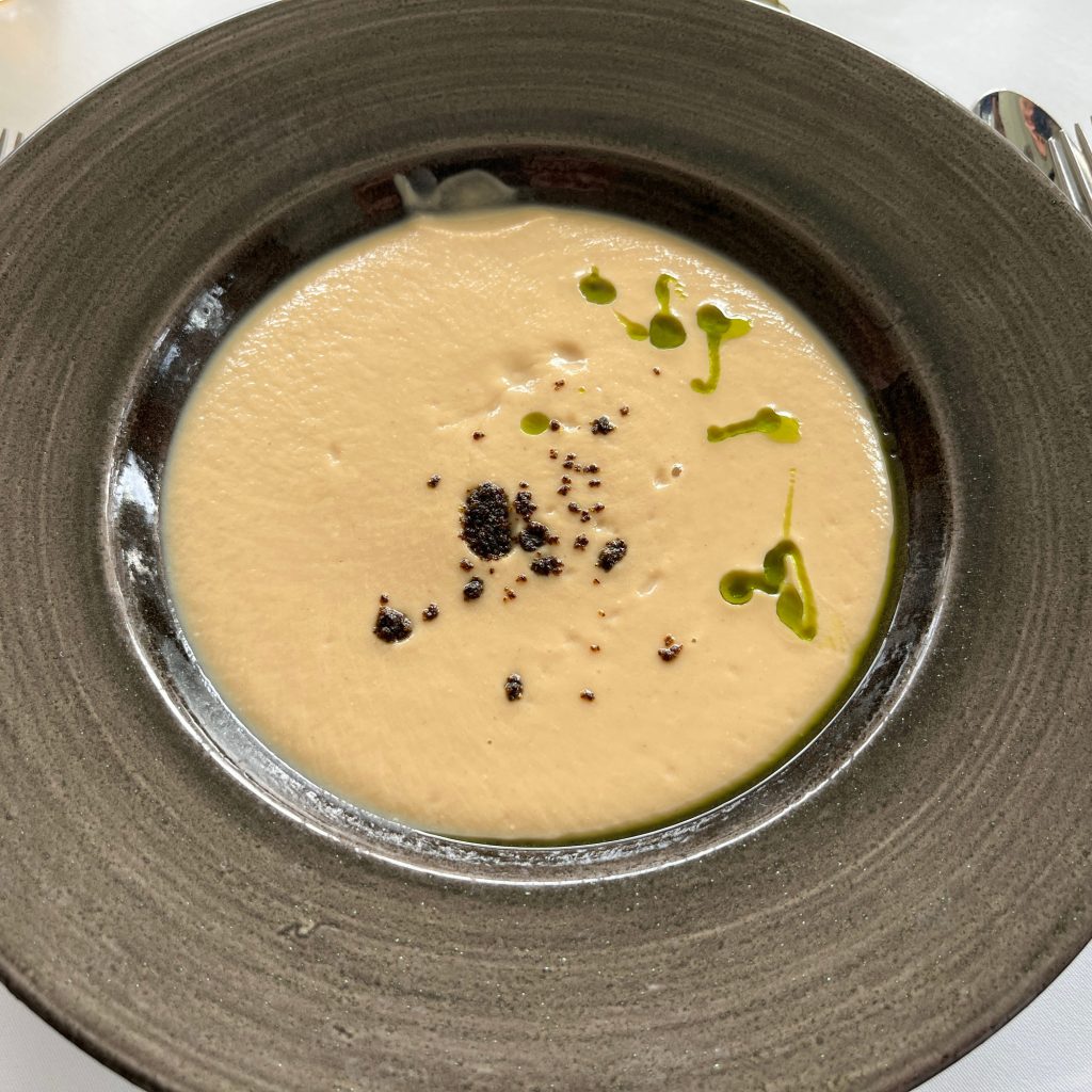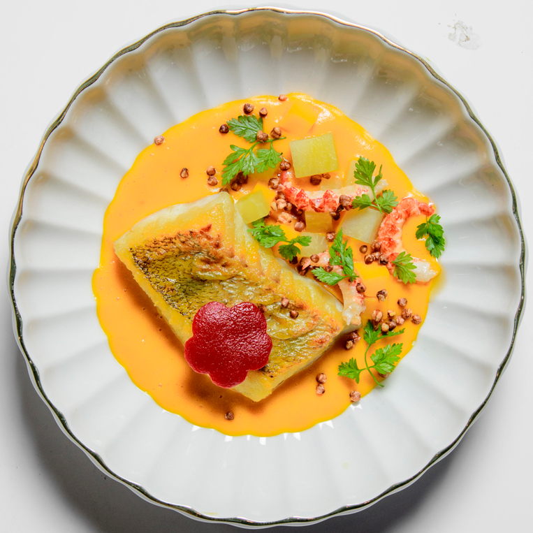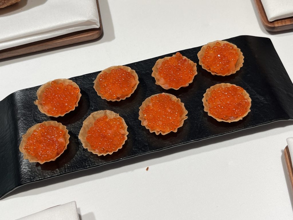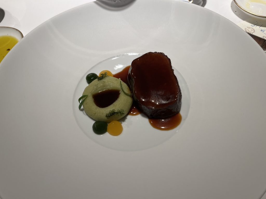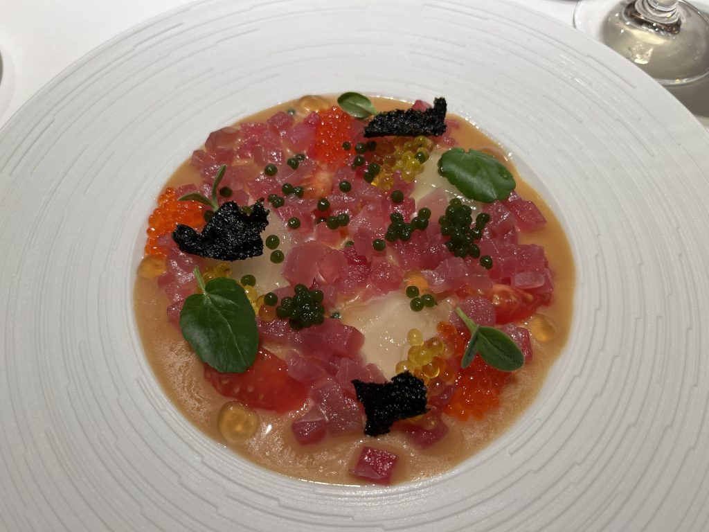 We arrive at 7 p.m. at the Arco restaurant on the 33rd floor of the Olivia Star building with a panoramic view of the city. Arco, together with Chef Paco Perez and Head Chef Antonio Arcieri, offers a refined fusion cuisine combining Spanish and Mediterranean flavours with Polish touches, resulting in extraordinary dishes. In 2024, Arco was awarded its first Michelin star in Gdansk (and the only one in northern Poland) in recognition of its exceptional cuisine and service. Cocktail tables draped in black, cheese pierogi, and caviar tartlets. Iberian ham croquettes. On the set tables, decorative detail: a silver sea buckthorn stem and its fruits in amber. Maciej: “We have reached the highest point in altitude.” The set designer is Dany Garcia and the style is Arco (bow). Presentation plates, very beautiful and glass clear bread plates. The starters are placed on the table, potato salad shaped in balls in the hollow of a container with hands clasped as an offering, trout caviar tartlets, Cebularz (onion bread). Oyster on beetroot juice placed on seaweed (Borscht & Oyster). Bluefin tuna, yuzu and tomato salad full of colour and freshness. Chawanmushi parsley roots. Italian groserano cheese risotto topped with two shrimps in head-to-toe. Venison and its sauce, green purée, a little overcooked. Revisited Tatin pie without dough and vanilla ice cream (szarlotka). The wines are remarkable. It’s Daniel’s birthday, mini cake with a candle, vodka with two glasses. La belle Agnès (Belle Hélène pear but replaced by raspberry). Mignardises with a beautiful presentation. Maciej and the Chef face us. Fabien comments: “It was an international dinner, with the flavours of three different countries, an exchange of ideas and tastes. Sixteen persons were working for us, amuse-bouches had the influence of Poland journey with their colours, flavours and textures. Creamy risotto, venison should have been cooked less. Dessert consisted of apple layers and cinnamon, belle Hélène new version. But wine bottles were not presented during the dinner.” Maciej thanks all the team.