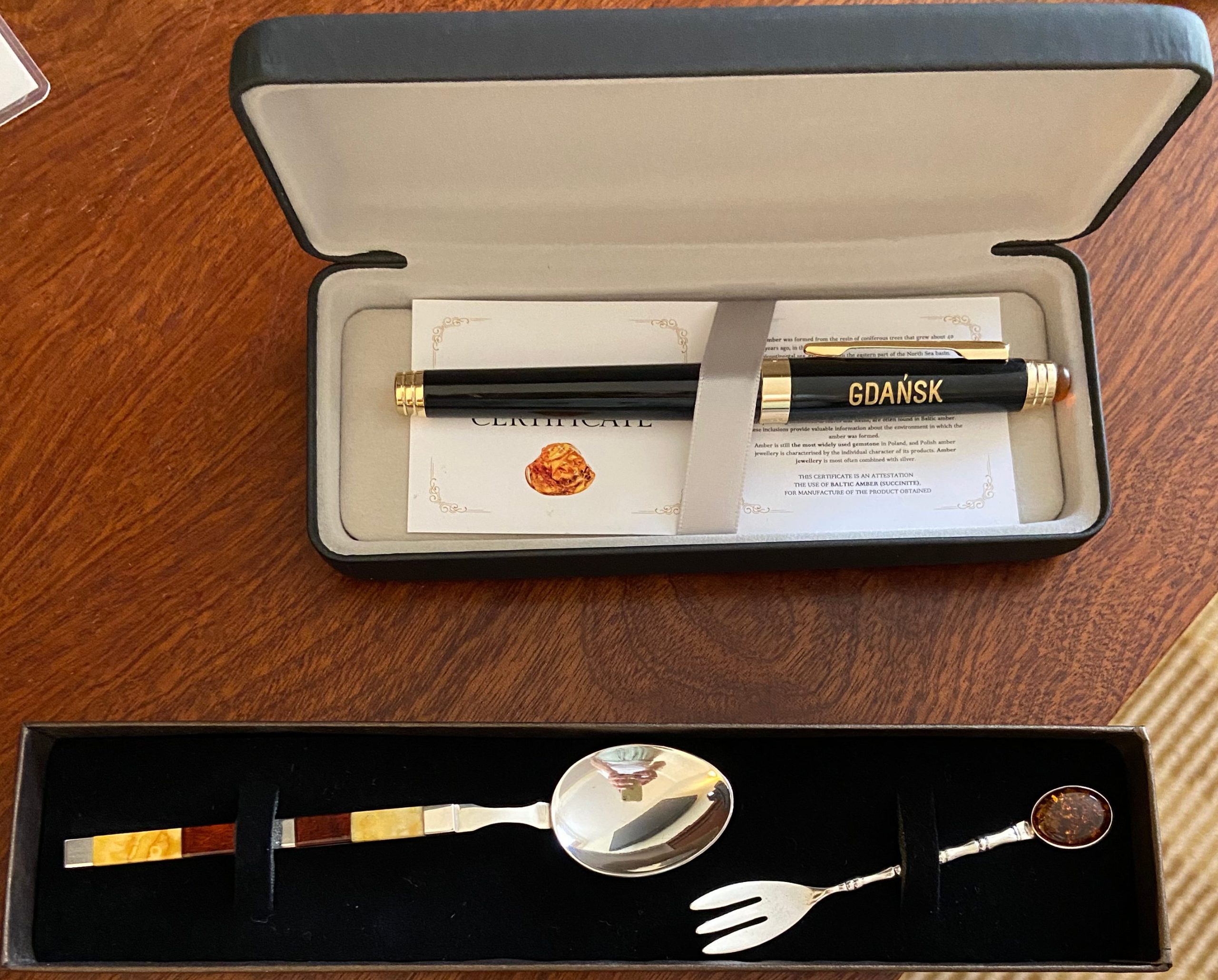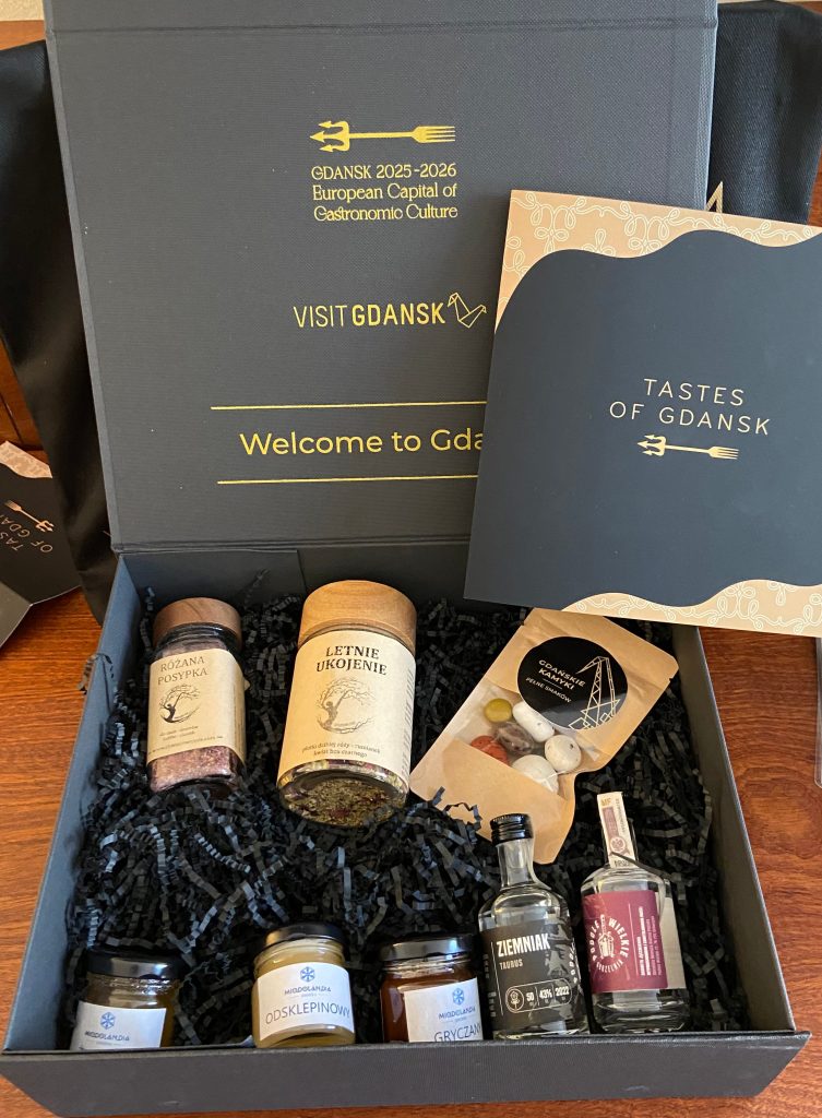 The 5-star Radisson Blu Hotel is located right in the centre of Gdansk. The nearby pedestrian street is full of restaurants and amber shops. In our magnificent room, a box Flavours of Gdansk, European Capital of Gastronomic Culture 2025-2026 with the drawing of the trident of Neptune and the teeth of a fork at the end of its handle. Inside: a jar of chamomile flower, wild rose and elderflower herbal tea, a jar of dried rose petals to sprinkle on cakes and desserts, two small bottles of vodka, one made from barley and the other from potatoes, three small jars of honey of different qualities and a bag of pebbles filled with apricot paste, anise or almonds under a layer of chocolate, a black shopping bag with the book “Solidarity and Lech Walesa 1980-1990” which traces back the solidarity movement that put an end to communism. It began with demonstrations by workers at the Gdansk shipyard who went on strike following the dismissal of an employee. Another book “Polish Culinary Paths” dedicated by the author — to the Members of the International Academy of Gastronomy (A.I.G.) — who has won several awards including the one for gastronomic literature granted by the International Academy of Gastronomy. A Gdansk pen with a Baltic amber cabochon at its end, a case containing a mini fork with amber at the end and a small spoon with a handle covered with two colours of amber, both in silver. Generosity and the pleasure of giving! The badges are also there with the miniaturized program on them!
