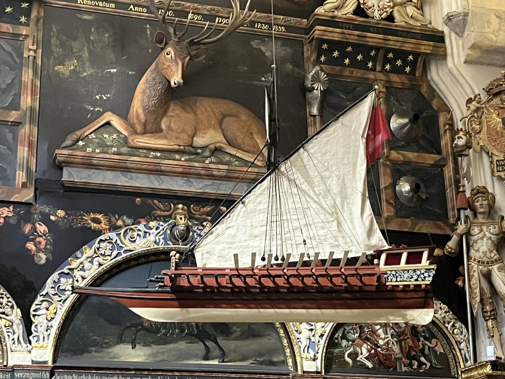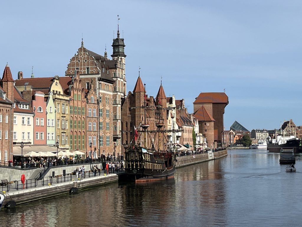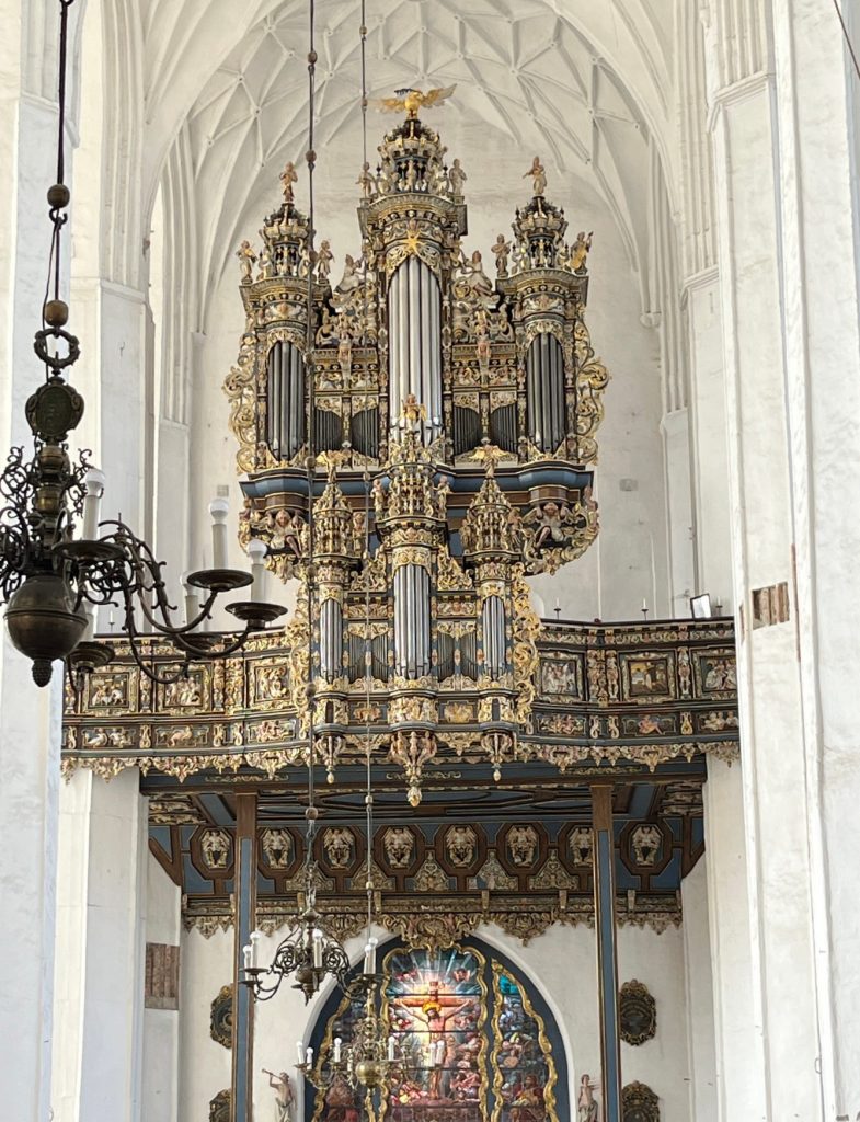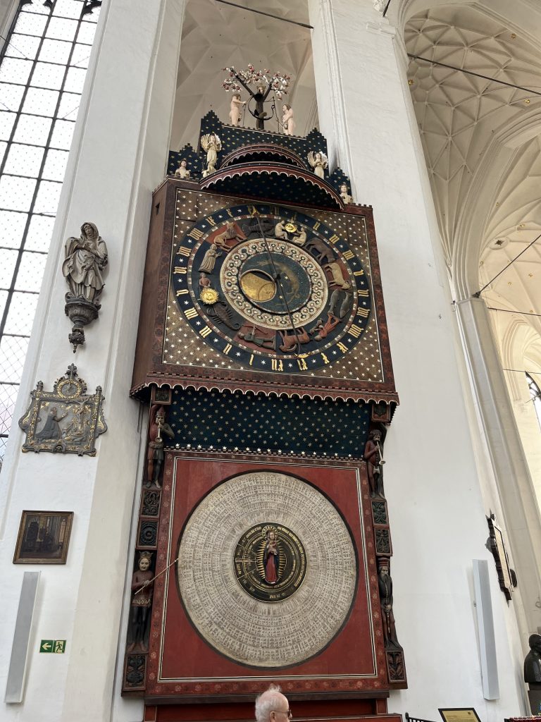 Saturday 13th: we are divided into two groups with guides and headphones to explore the old town that is more than 1000 years old. Beautiful church where a bishop baptized people in 997. Motława River, the Vistula River. The historical fountain of Neptune which represents the God of the sea. The medieval port with Granary, the attic island, goods warehouse area. At night the drawbridges were raised and dogs were released. Medieval ramparts, green bridge. Castle of the Teutonic Knights who seized Gdansk, later returned by the city’s inhabitants. Medieval crane, lifting machine. Long Market Square (Długi Targ). Coats of arms, lions with two crosses, eagle, crown, Prussian eagle, partition of Prussia at the end of the eighteenth century. Mr Farenheit, inventor of the thermometer, was a native of Gdansk. Mr Van den Mensk, grain trader. Goldwasser is a yellow liqueur (22 or 23 carat gold flakes). Hidden basin, Neptune transported elsewhere, Artus Court (King Arthur) in Gothic style. Mariacka Street (from Marie). The construction method is as follows: wooden piles, planks and then stones, brick buildings. Presbytery, Basilica of St. Mary, the largest brick church in Europe with a capacity of 25,000 people. Organ case. A charity party was held there in 2019 during which Paweł Adamowicz, the mayor of the city, was fatally stabbed. Medieval polychrome paintings. Astronomical clock, with a single hand and the signs of the zodiac in front of the numbers. Piwna Street (beer brewers). A 40-kilometre canal, dug by the Teutonic Knights, supplied the city with water in the middle of the fourteenth century. A concert of chimes that we hear from the street.