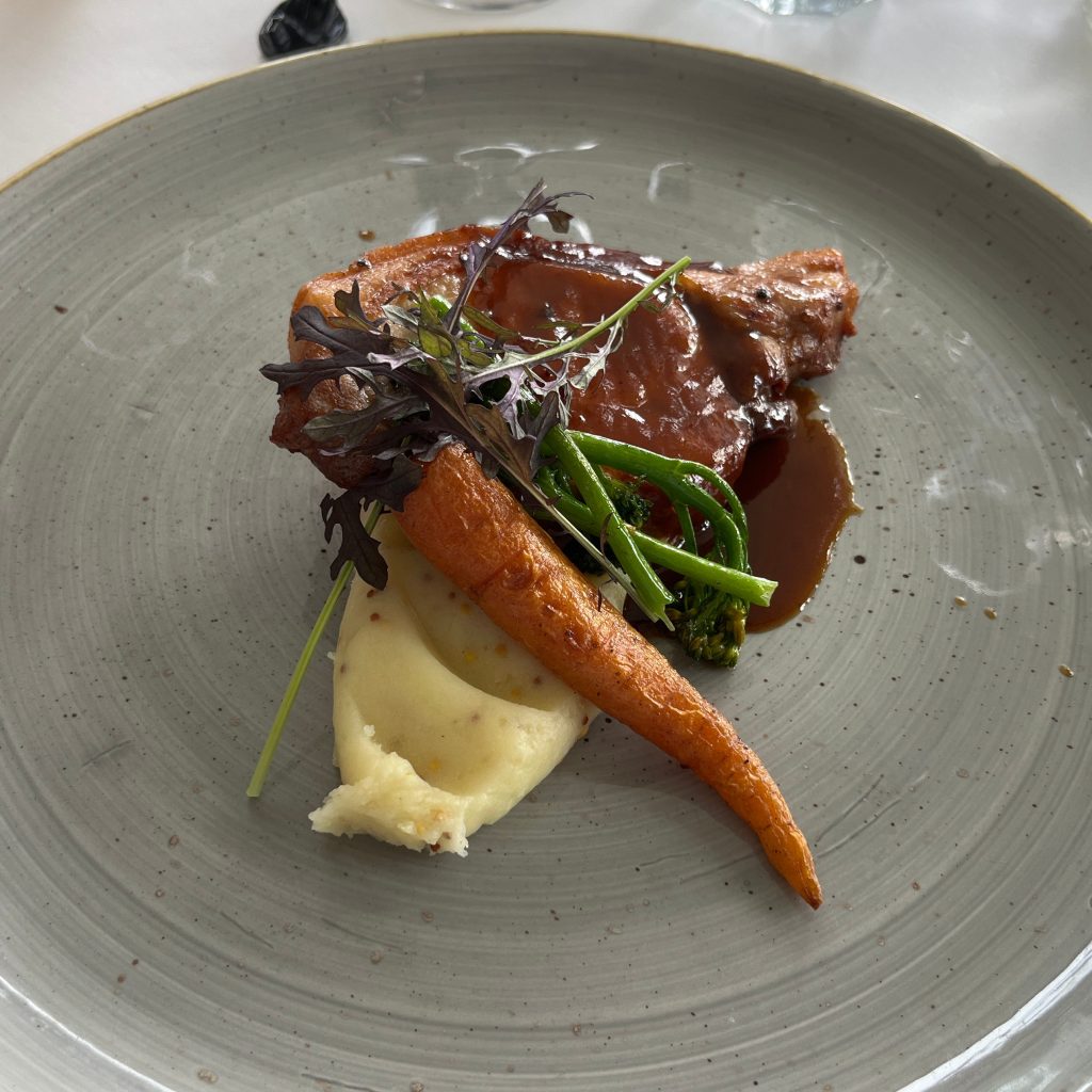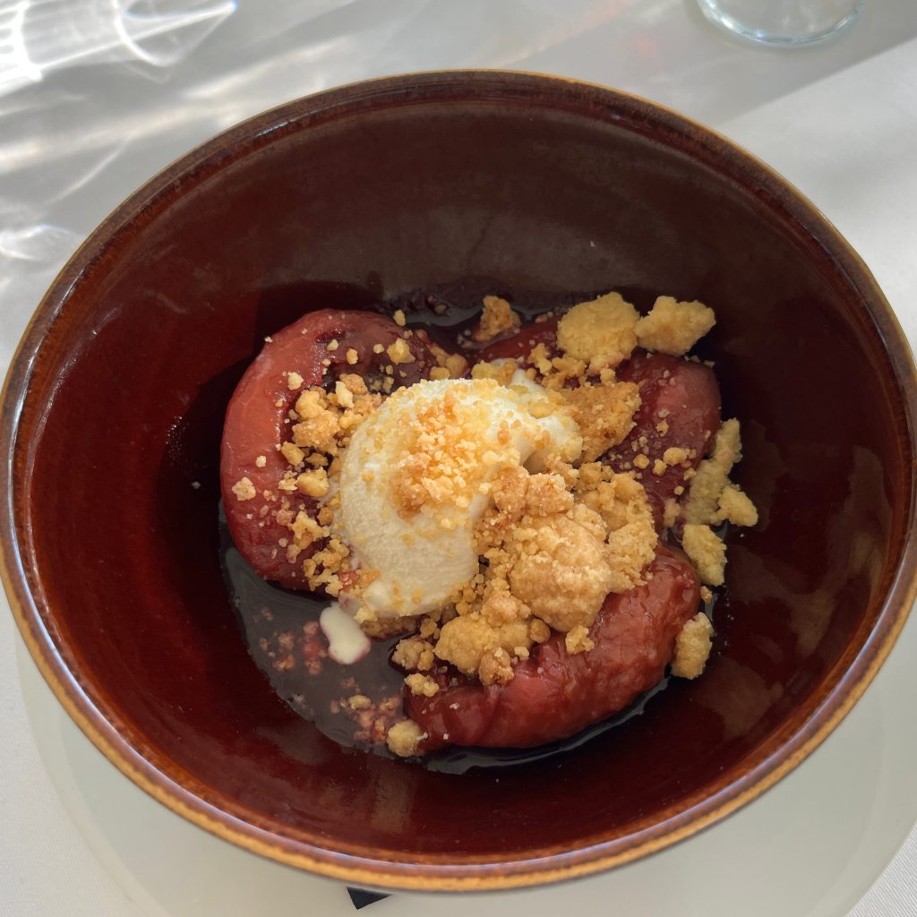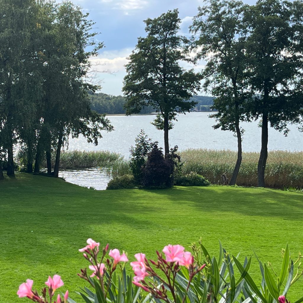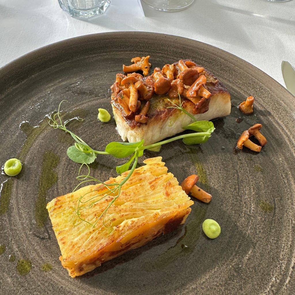 Bus to the Między Deskami restaurant by the lake which offers local cuisine. Maciej: “Kasia and I chose the menu, no wine but local cider and apple juice.” Bay windows to the garden and lakeshore. White tablecloths, vases of white flowers. The weather is magnificent, the sun shimmers on the lake. Chef Lucas: “I’m going to cook for you. Apple trees can reach 100 years of age, there are two kinds of apple juice, sweet or sour. Two different beers, light and heavier“. Smoked fish pâté on brioche bread, pickle, dill gel and powder, lemon caviar, good. Soups of your choice: sturgeon soup or roasted cauliflower soup with caviar grains, leek powder and croûtons. Everything is very good. The main course is also to be chosen: fish fillet, gratin dauphinois, chanterelles, dill oil or wild boar steak with cider sauce and creamy honey mustard seed purée, wild broccoli, candied carrots. The decoration is very fine and omnipresent in each dish. It is a family affair with bee breeding and natural liquors. Refreshing Dzika quince cider and cherry. Maciej: “There is no more sincere love than the love of eating and drinking well. Thank you for always being punctual, there are two days left, the atmosphere will develop for the best. Thank you Thomas! Applaud the Chef“. Dessert consists of local prunes in red wine and delicious yoghurt ice cream with cardamom, at the bottom of a crunchy crumble. Maciej thanks the Chef for the kilometre zero ingredients. The buses leave at 16.15 pm.
