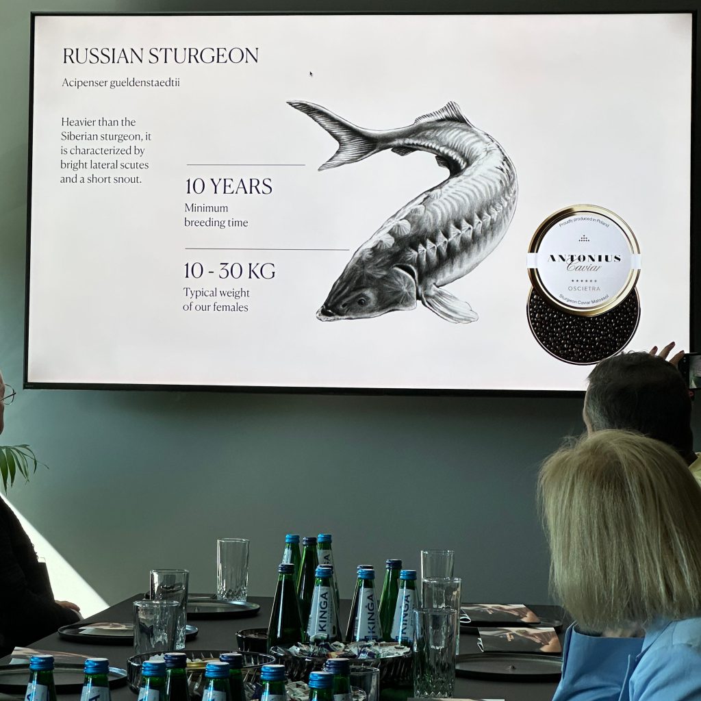 Friday 12th: Maciej calls the roll in the lobby and we get on two mini buses. There are members from various countries. Departure at 9 am for the Antonius Caviar farm near Olsztyn, producer of Polish sturgeon caviar known for its superior quality and sustainable farming methods. Antonius Caviar operates cattle farms located in idyllic landscapes in the Polish Lake District. Antonius Caviar was the official partner of the 40th anniversary of the A.I.G. in Paris in 2023.