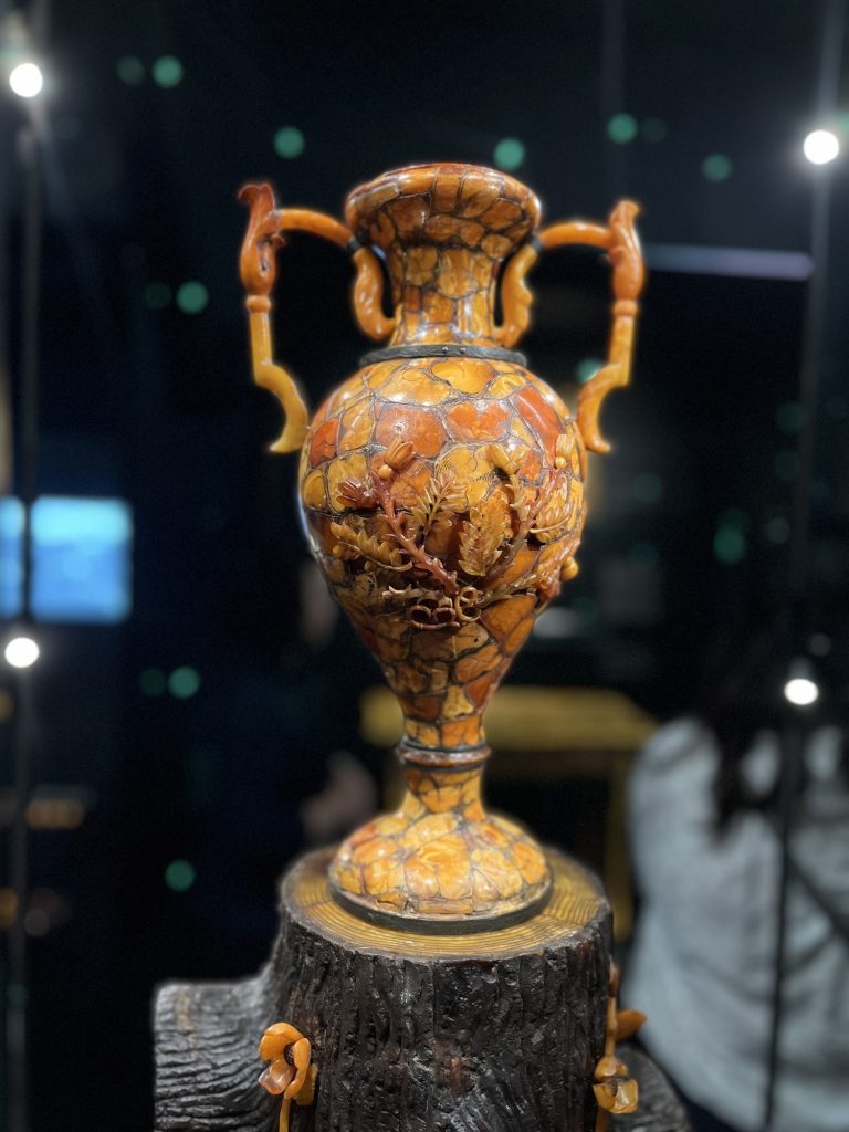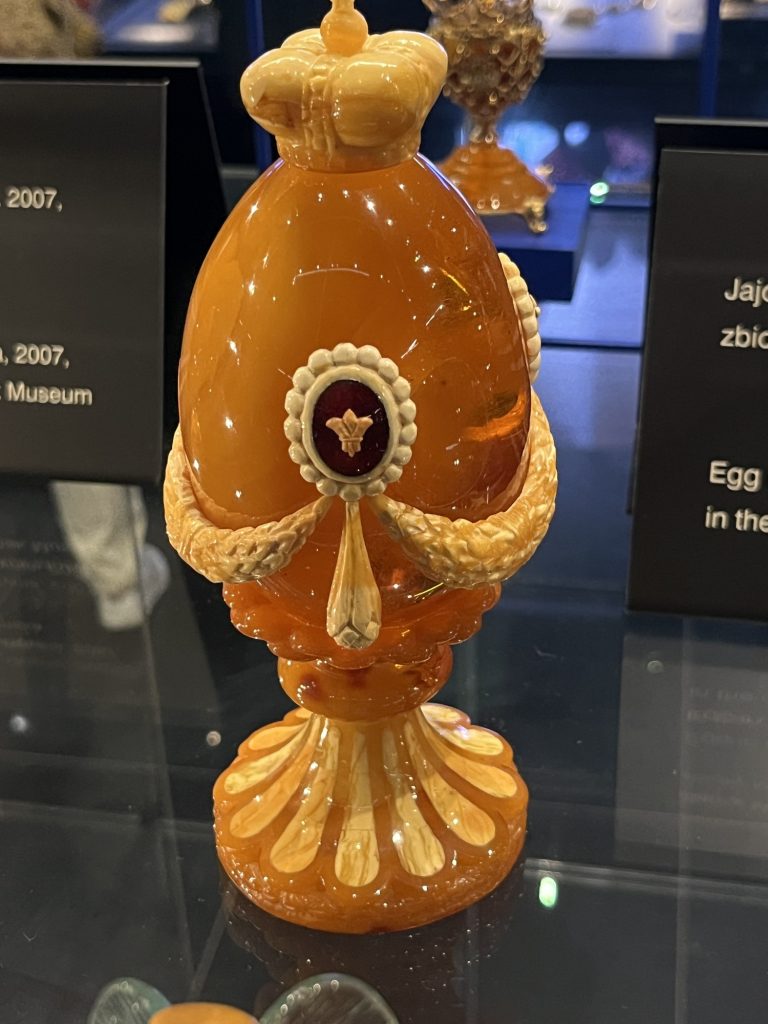 Amber Museum which was a warehouse at the time. The museum presents specimens of natural amber as well as elaborate pieces, highlighting the naming of Gdansk as the world capital of amber. Amber is a fossilized and hardened resin. Baltic amber was formed 40 million years ago. Sap, calcium, rare white amber. Pieces of amber in seaweed. Mixed with other ingredients, amber had medicinal properties, particularly to prevent the spread of the plague, nicknamed the Black Death. Amber chamber made for King Frederick I of Prussia by craftsmen from Gdansk who in turn offered it to Tsar Peter the Great of Russia during his official visit in 1716.
