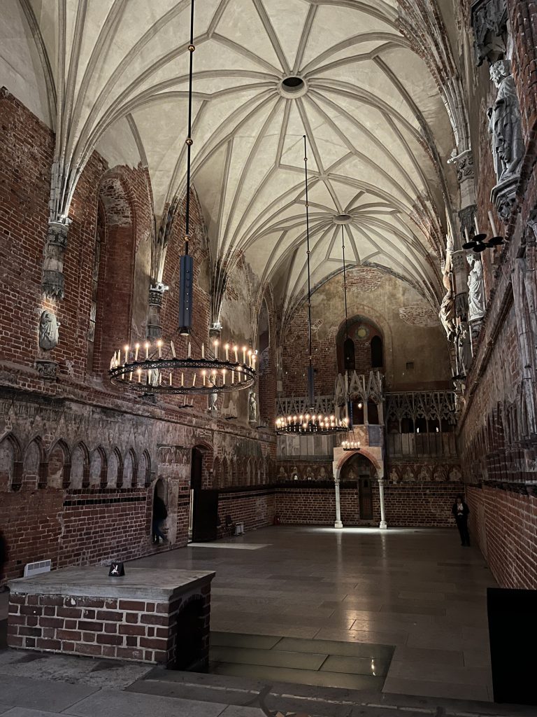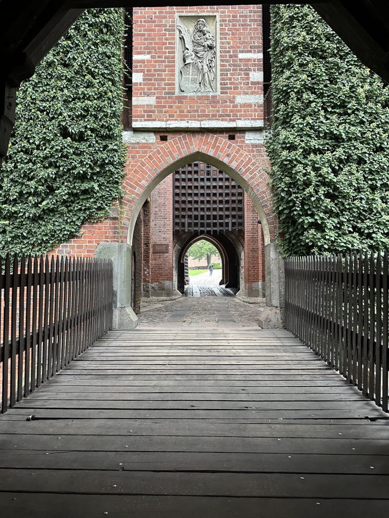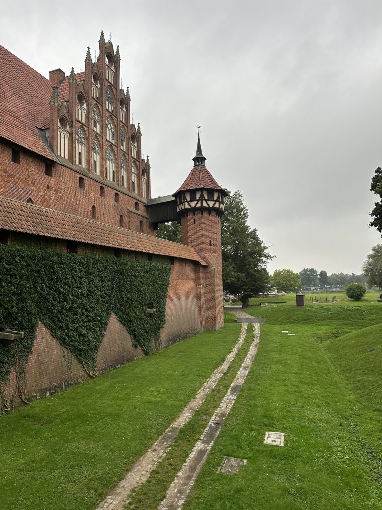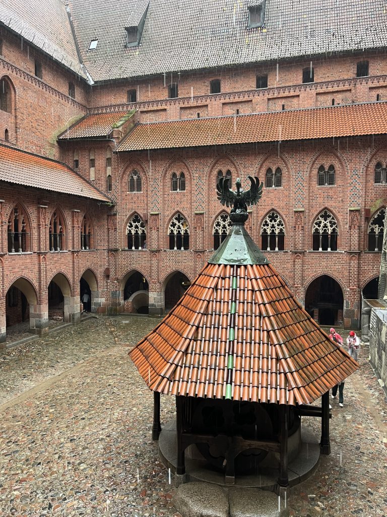 Sunday 14th: the passage to the breakfast room has a glass-floor under which are arranged on a white background old terracotta jars and kitchen utensils, objects of excavation. On board the bus at 10:10 am. Maciej gives information about the current day. The journey to Malbork Castle takes 50 minutes. We are welcome by the mayor and receive lapel pins in the shape of coats of arms with the castle in red. Our guide is dressed in a long red dress with a white nun’s headdress. Built by the Teutonic Knights in 1280, it housed their headquarters and was a powerful symbol of medieval military architecture in gothic in style. It is composed of 30 million bricks and has 14 gates and 4 drawbridges. Largely destroyed during the Second World War. The lighter bricks are those that have replaced the destroyed ones. Tower to transmit messages, chapel, stables, granaries. Listed as a UNESCO World Heritage Site in 1997, it is the largest brick castle in the world. Courtyard, bath every 15 days… Henri IV passed through it. The Teutonic Knights were the enemies of Poland. Monastery. Heating room in the basement, ancestor of underfloor heating… The oven consists of two parts: stones heated in the oven, and a chimney. Large room that can accommodate 400 people for meals (refectory). Feudal system. A fourteenth-century chapel, the floor dates from the Middle Ages. Grand Master’s Room, frescoes of 1404. The vine symbolises wine. They used to wash their hands before meals. Seasonal dining room. Desk in the decorative style of the nineteenth century. Church. Detail of the toilet: above the toilet with lid, a wooden structure containing cabbage leaves (used as toilet paper). Depth of the moats. Monks’ dormitories, cult of saints. Grand Master’s chair, choir. We are soaked by the torrential rain.